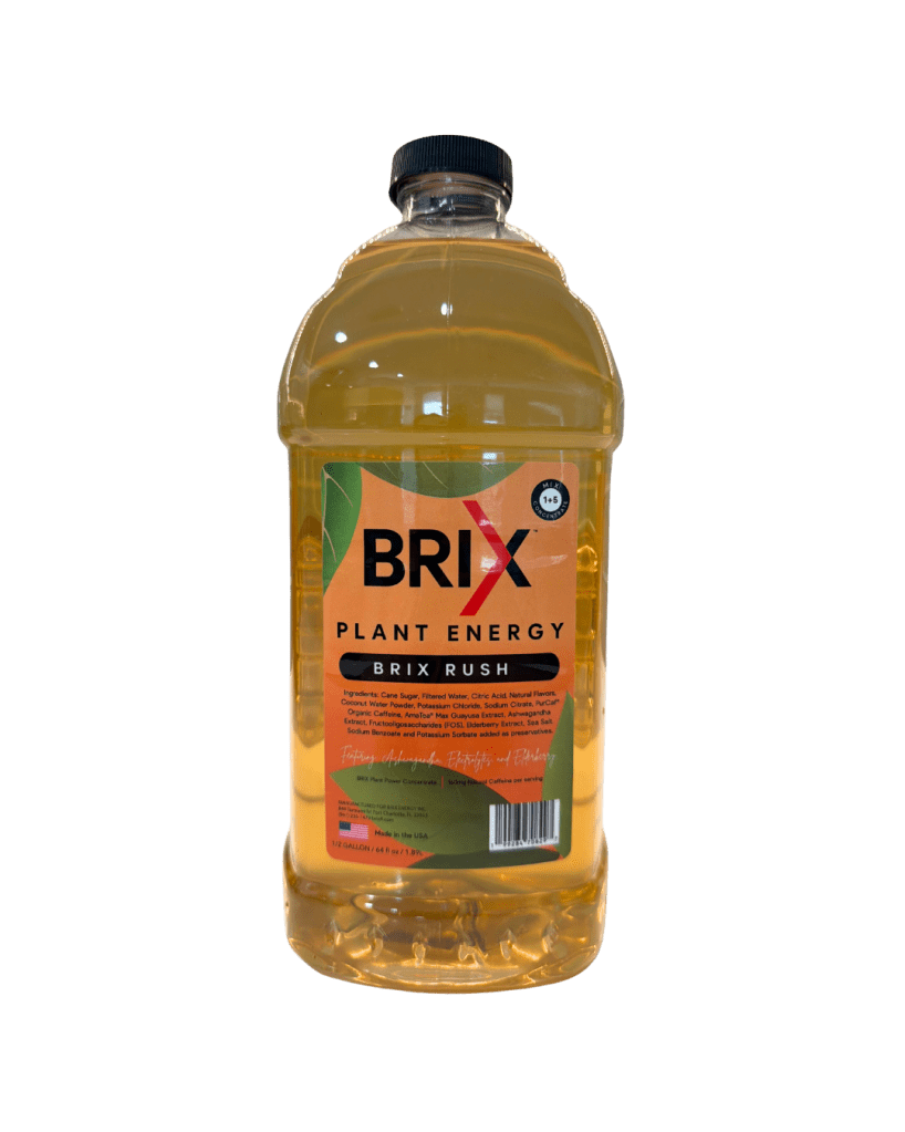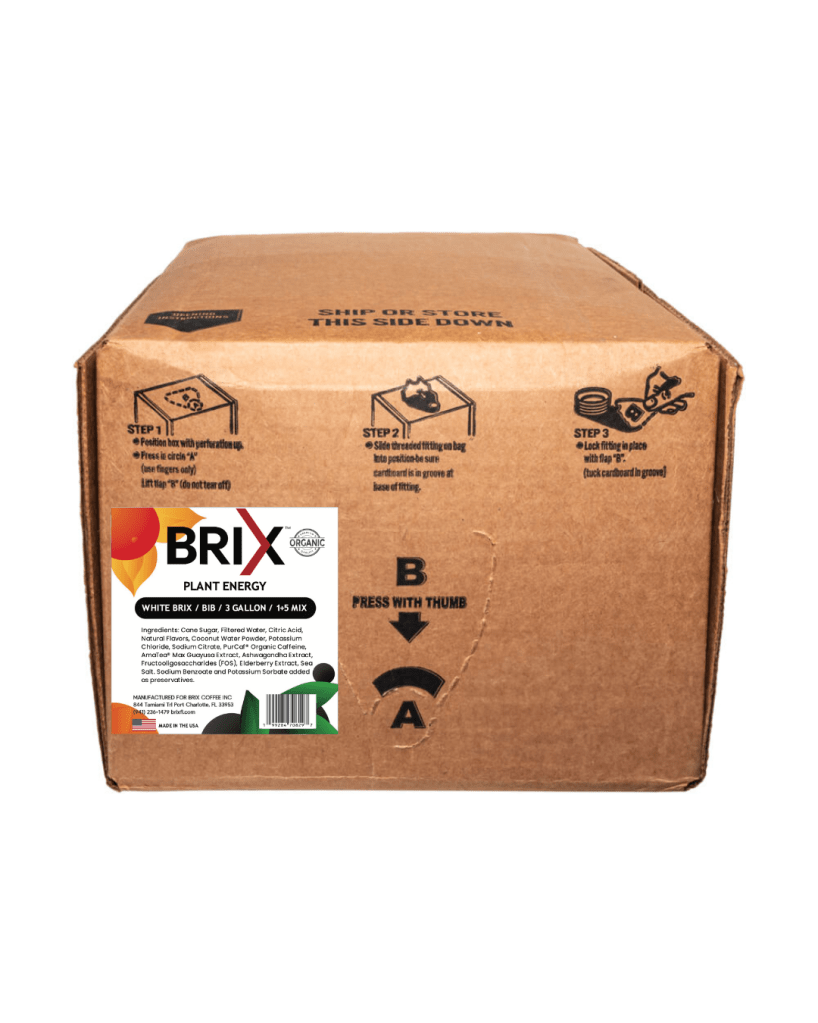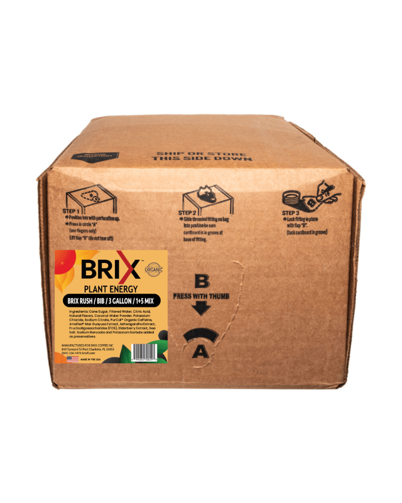 We sell 2 different types of our Brix Energy. White Brix and Brix Rush. You can either purchase it in BIBS (Bag in Box) which is 3 gallons. Or our bottles which are ½ gallon or 64 fl. oz. The bibs are connected to a soda machine, within the road machine it is mixed with CO2 and water. The bottles come with a pump and are mixed with sparkling water manually before the flavor is added.